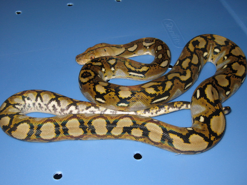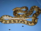 1.0 07 100% Het Albino Retic. 4.5ft long. Eating p/k or f/t mediums, and such a cuddlebug. Just wants to find a place to curl up on you, and that's where he'll stay until you move him.
