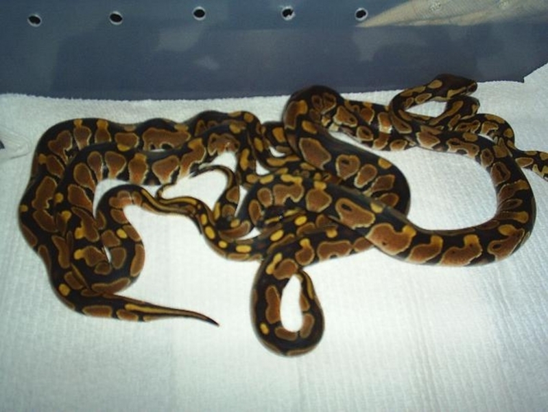 These baby females were born 5/21/05. They were produced from a documented het male from Cypress Creek Reptiles bred to what was sold to me as a Bob Clark het but I got 7 eggs and no albinos so most likely she isn't. So the most I can guarantee is that these are 50% hets. She is however an excellent black back. The babies have her pattern kind of "under" the father's pattern. I personally wouldn't call them black backs too, but they are by some people's standards. Just ate for the second time and are ready to go. Currently feeding on live hopper mice. They haven't accepted f/t yet. I'm asking $625 shipped for all 6 - OBO. Or $125 shipped a piece. And I will of course include documentation verifying genetics. I also have paperwork for the father and many available pics and references to verify these. And I will stand behind them 1000%. I'm not gonna disappear. I'll always be here if you ever need anything relating to them down the road. So you don't have to worry about the "het" issue. Please contact me at ToxicPhillie@aol.com for any reason. Thanks alot. Ryan.