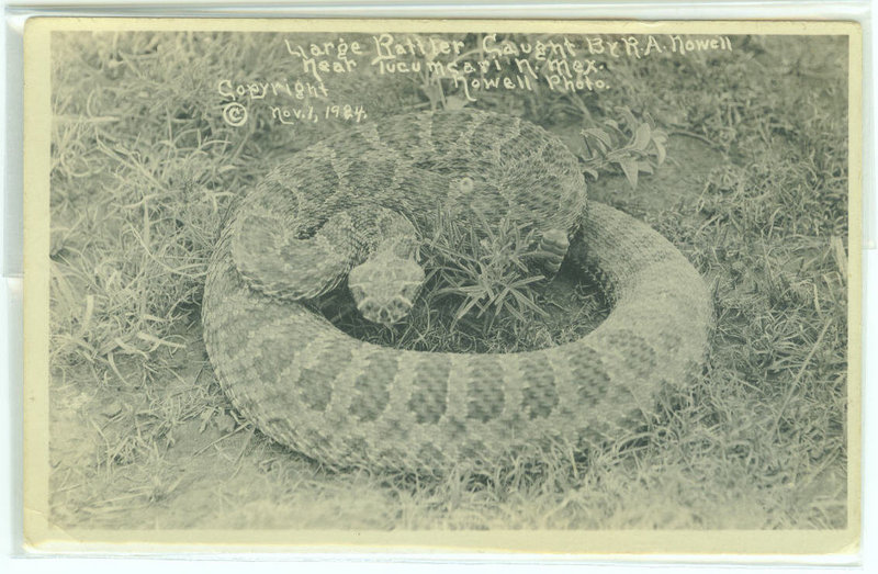 This is a unused 1924 B/W Real Photo Postcard that shows and reads "Large Rattler Caught By R.A Howell near Tucumari, New Mexico, Howell Photo, Copyright Nov. 1 1924. Back of postcard is unused and has never been postally used. Has some very minor creasing & corner wear. But in overall excellent condition. I am asking $35 and shipping is via usps in a well packed padded envelope for $3. I will accept paypal, money orders, and cashiers checks. For any questions please email me at tenn_eseejed@hotmail.com. Thanks for looking