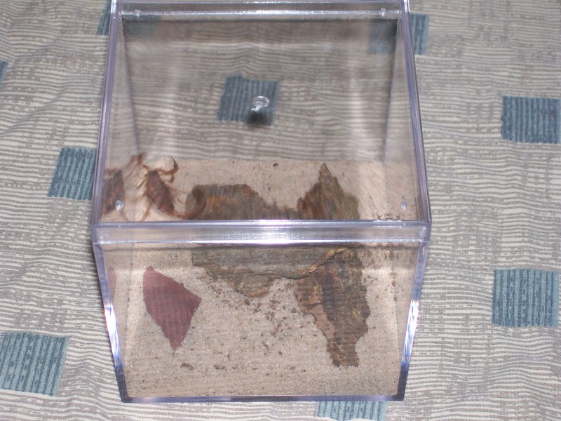Scorpion Acrylic cube kits.....Easy way to have a scorpion for display in your herp room or where ever you choose. (water dish not provided, we use 2 liter pop lids) Lids fit snug on the top, however you will want to make sure your scorp cannot reach the top from the bark hides.