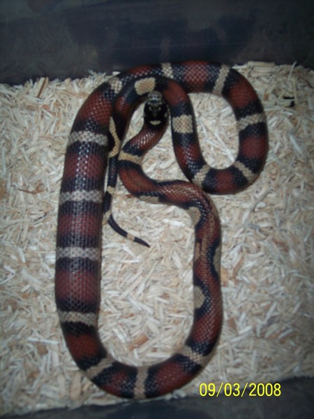 Awsome looking adult hybrid caifornia king crossed with a pueblen milk with a smokin and very unique pattern,and as you can see by the big lump in his stomach he has no problem feeding.I'll be at the next hamburg show if anyone is interested in saving on the shipping.I'm looking to get $125 or willing to trade for anything.thanks,Jeremy